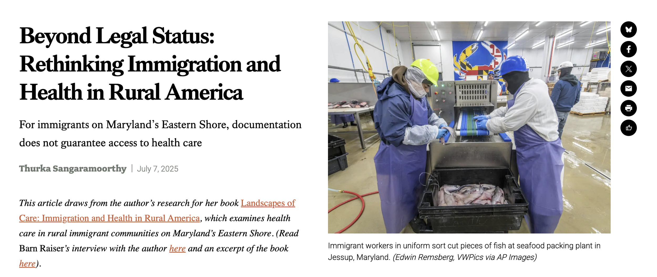 Citation: Sangaramoorthy, Thurka. “Beyond Legal Status: Rethinking Immigration and Health in Rural America.” Barn Raiser (blog), July 7, 2025. https://barnraisingmedia.com/rethinking-immigration-health-rural-america/.